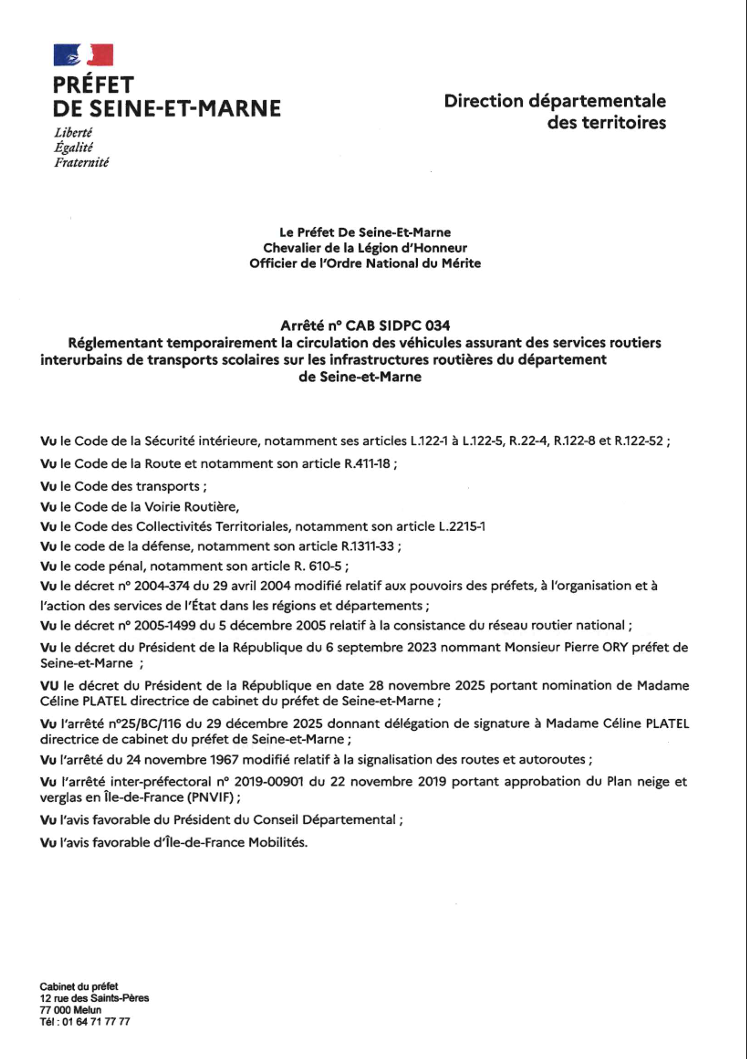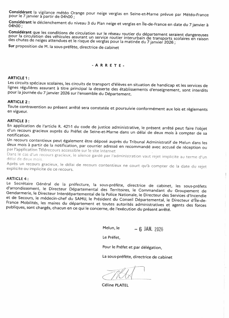 En raison des conditions météorologiques, nous vous informons que les transports scolaires seront suspendus également pour la journée du mercredi 7 janvier 2026 sur l'ensemble du département de la Seine-et-Marne.