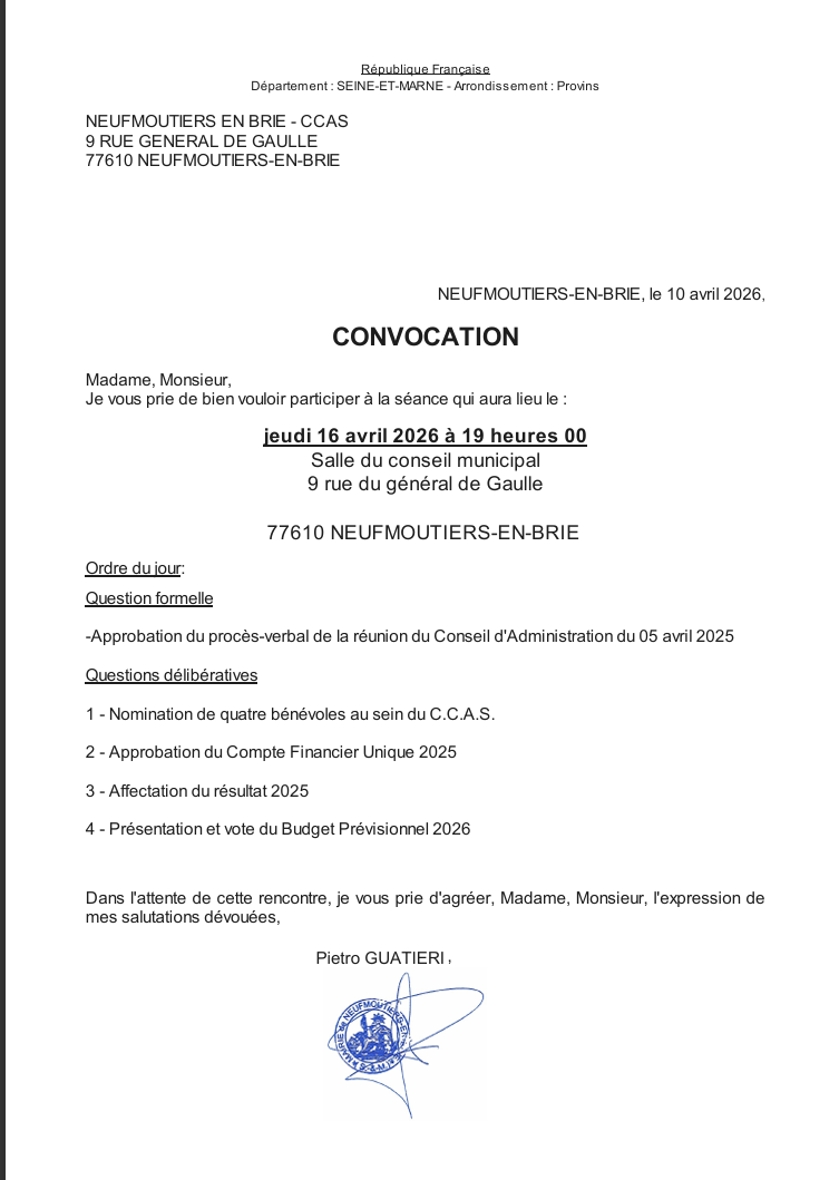 CONSEIL D'ADMINISTRATION DU CCAS jeudi 16 avril 2026 à 19h30